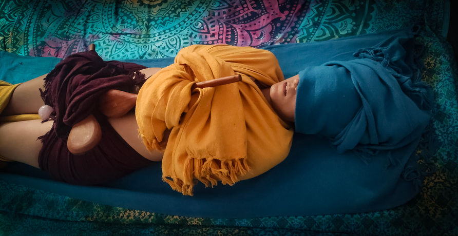 Envolve o uso tecidos, mais conhecido como rebozo, seu nome tradicional mexicano. Um xale e tecido que também é utilizado em técnicas de massagem, sendo um grande aliado das mulheres nos cuidados e processos durante a gestação, parto e pós-parto. O rebozo é usado para fechar suavemente os ossos, podendo ser uma experiência profunda para algumas pessoas. Particularmente, essa experiência me remete ao casulo e o sinto como um abraço curativo.